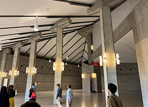 千葉県立美術館に到着し、美術館の皆様にお出迎えいただきました。まずは、美術館建築について、ボランティアの方から丁寧なご説明をいただきました。 |