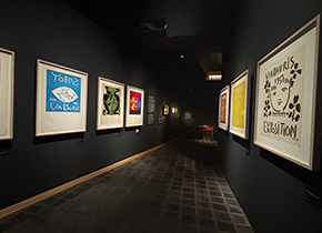 はじめに地下の、クールな黒の空間、といった雰囲気の展示室で企画展示を見ました。企画展示は年に一度、展示替えがあります。陶器は絵画より堅牢なので、長期展示が可能なのだそうです。 現在の展示は「ピカソ·セラミック-『見立て』の芸術」。水差しを鳥や女性に、お皿を人の顔に仕立てたりするピカソの陶器制作と、日本の「見立て」の心に共通するところを探っていく内容になっています。 |