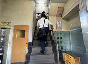 ギャラリーの窓から、新宿のいろんな通りが交差している様子見え、街の蠢きと作品が重なって、見てくださる方々それぞれが、独自の体験をなされる可能性がある」とのこと。 「ビルやギャラリー空間の物理的制限により、大きな作品が展示しづらい点はあるが、映像やサウンドなど、タイムベースドメディア作品の展示空間としてのポテンシャルを感じている。歴史を振り返ってみると、これまで誰かが、制約を突破して自由や可能性を、われわれとしての今生きている存在に残してくれた。 そうであるからこそ、私は制約する側ではなく、広げる側に居続けたい。そのためにはリスクが多少伴うことは覚悟し、信念をもってやり続けていきます」と仰っていました。 インパクトのある展示を拝見した後の急な階段は、すべり落ちないかドキドキしてしまいますが、遺跡の階段の上り下りの感覚に似ているな〜などと思いながら、恐る恐る1階まで下りてゆきました。 こういう勾配の急な階段を持つビルも、ある意味「遺跡級」なのかもしれませんね。 |