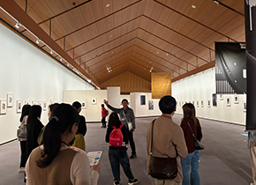 千葉県立美術館に到着し、美術館の皆様にお出迎えいただきました。まずは、美術館建築について、ボランティアの方から丁寧なご説明をいただきました。 |