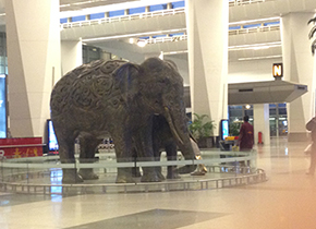 | この男性たちは「チャイ」を売っている人たち。 種火の石炭の上にやかんをかけているのです。 インド名物のひとつ。どこででも飲めます。 そして、その美味しさもさまざま。 あまりにも懐かしくてつい1枚撮ってしまいました。 インドといえば象・・・なのでしょうか?! デリーの空港には、こんなでっかな象の彫り物が置いてありました。たったの半日のデリー滞在でしたがやっぱり「もっと見たい」と思ってしまいます。 今回はアクシデントついでのデリー観光でしたので、インドについてはまた改めて訪問したいと思いました。 やはり、インドといえば仏跡だらけ・・ですしね。 いつか、訪問してみたいです。 最後に。今回の旅行は最初からスケジュール変更を余儀なくされ、そんな中で出来るだけ予定していたスケジュールを落とすことなく遂行できるようコントロールしてくださった現地ガイドのスシールさん、ドライバーさんには感謝しております。 そして、今回ご添乗いただきましたトラベルサライ小倉さんには、現地で漬物を作ってくださったり、急なインド入国でのビザ申請・写真準備など事細かに動いていただき、安心して旅行を終えられたこと感謝申し上げます。 そして、今回ご参加いただいた皆さま、急なスケジュール変更にも快く対応してくださりありがとうございました。また、皆さまとご一緒できることを楽しみにしております。 (ARTTRANSIT事務局) |