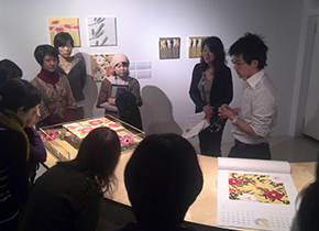 作品の大きさ、展示の方法、そしてモチーフなどなど、そのすべてが、現代の日本の住環境や日本人の好みなどを意識した作品づくりとなっていて、皆さん真剣に楚里さんのお話を聞きながら、作品を鑑賞されておりました。 どうやら、テキスタイルやインテリアデザインからインスピレーションを感じていらっしゃるようで、例えば、作品自体をキャンバスの側面までしっかり書きこまれていたり、室内に額縁に入れずにそのまま置いても楽しめるような工夫を、さまざまな角度から考えていらっしゃいました。 |