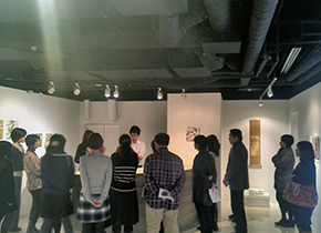 2014年も美術めぐりのガイドは中村宏美さんにお願いしています。 伊藤忠青山アートスクエアのギャラリストである猪俣さまのお話をいただいた後、画家の楚里さんから直接、作品や作家としてのお考えなど、色々お伺いいたしました。 楚里さんは、1985年生まれの若い画家さんですが、作家があまりにも自分の思いや表現にこだわりすぎるあまり、鑑賞者が置いてけぼりになっているような気がするという現代のアートシーンに対して、ご自身は、買う人・観る人にとって親しみやすいものを作りたい、もっと日本画を身近に感じてほしいという思いから、さまざまな作品を制作されているとのことです。 |