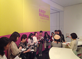 人気の展覧会であること、作品点数がかなり多いこともあり、解説の場所が制限されてしまいましたが、皆さま各々にそれぞれのウォーホルを楽しんでおられるように思いました。 単純に「好き」か「嫌い」かだけでも皆さんと共有しながら作品を鑑賞していくのにはぴったりの作家かもしれませんね。参加者の皆さまとあーだ、こーだ言いながら色々と見れたのは、とても収穫だったような気がいたします。 |