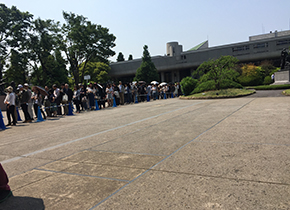 5月の美術めぐり当日を迎える数日前、国立西洋美術館を含む「ル・コルビジュの建築群」が、いよいよ世界遺産の諮問機関であるイコモスが登録がふさわしい旨を勧告したという報道があり、もしかしたら混雑するのでは? と、若干の不安を抱えつつ、当日行ってみたら、この行列です・・・。 国立西洋美術館が、素晴らしい建築なのだということ、それを一目見ておきたいという人が、きっと足を運ばれているのでしょう。それにしてもすごい行列です。 敷地を出て、さらにずずずっとその列は続いておりました。 |