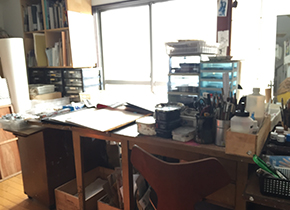 あいにくの雨模様の空の下、駅からの坂を上ってほどなく、高台のマンションの眺めの良い上層階の一室にあるアトリエに到着。 玄関のドアを開けてお邪魔すると、中は美術書籍や彫刻、古今東西の名画の絵葉書に囲まれた素敵な空間。 |