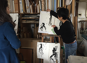 画家ご自身の描かれた作品も何点か掛かっていました。踊る人の姿のような抽象的なドローイングは、実際に踊るダンサーを目の前にして一瞬で描くライブペインティング。水気を多く含んだ墨線が水彩紙の上を自由自在に飛び交う躍動感に溢れた作品です。
