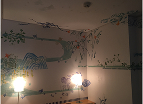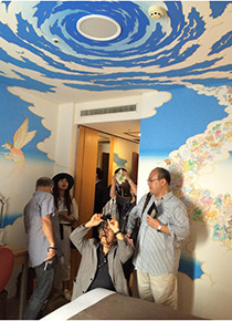 2.妖怪/馬籠伸郎 「妖怪を英語に訳すとき少し悩みましたがモンスターでは違うのでそのままYOKAIにしました」 「天井にも隙間なく描いているのが特徴です。ミケランジェロみたい」 「製作期間はみなさんバラバラで、短い方は2週間、長い方は7カ月。1部屋作る間はその部屋は使えず、その部屋のベッドを置いておく部屋、アーティストが泊まる部屋と、3部屋つぶすことになります」 「名古屋に住んでいる方や教師をされている方などは土日だけ描くなど、時間は話し合って融通が利くようにしています。個展の予定があったらそのあとにするとか」 |