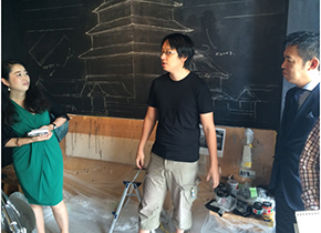 4.城/水口和紀 制作中の水口さん 「江戸城のプラモデルや資料を集めて当時の姿を勉強しています」 「建造物の大半は明治初期に燃えてしまったので写真から、石垣は現存しているのでスケッチして描きました。着手してから数カ月経って、自分より後に制作を開始したアーティストにもう4人抜かれてます」 「入り口は城門をモチーフにしていて、異空間に入ったような感じを狙っている。全部がコントロールできるのがアーティストルームのいいところなので、タイムスリップを感じてほしい」 「窓際に面した部分だけ金箔を使って、耐久性を高めています。他の部分は真鍮箔です。貼る用の金箔には銀や銅が混ぜてあるのでお酒に浮かんでいる金箔とは違うものです」 「アーティストルームの制作を通じて、技術的なことだけでなく、制作のスタンスに対しても勉強になった。普段は描きたいものしか描いてないけどこの機会がなければこんなに日本建築をつきつめることもなかった」 |