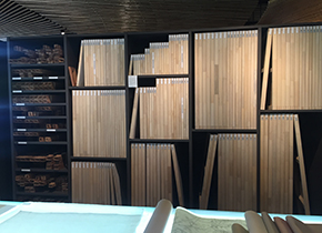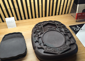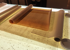 メンバー全員が見とれてしまいました。そのほかにも墨、硯、和紙、膠など様々なサンプルが作品のように並べられ、いつまでも見ていたい気分になります。 |