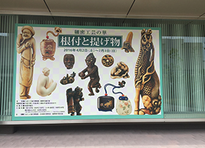 まず、二階の特別展示室へ入ると「根付」の数々が展示され、そのバリエーションの多さ精密さに心奪われ、時間を忘れて鑑賞させて頂きました。 他にも、精密な小さな家具、精密かつ大胆な衝立などの展示があり、小さな根付とのコントラストに展示の工夫が感じられました。 |