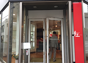 ちょっとだけ賢くなったうえ、秋の名園を散策してゴキゲンのメンバーが次に向かったのは、同じく南青山、骨董通りに面した「伊勢半本店 紅ミュージアム」。 文政8年(1825年)日本橋小舟町に紅屋として創業し、伝統的な紅作りの技法を守っている唯一の化粧品メーカー「伊勢半本店」の企業ミュージアムです。 はじめに、スタッフの方から館の概要と紅の製法などについてレクチャーいただきました。紅は山形県の最上川流域を中心に栽培されている良質の紅花を原料として作られます。紅花の色素は99%が黄色色素で、赤色色素はわずか1%しか抽出できず、とても手間暇のかかる仕事です。現在、紅作りの職人さんは2人しかいないそうです。精製した紅を「紅猪口」という小さな容器に塗り、乾燥させたものが昔ながらの口紅「小町紅」となりますが、良質な紅は乾くと「玉虫色」になるとのこと。実物を見せていただきましたが、まさに玉虫の翅の如く光り輝く緑色。不思議な色彩の妙です。 |
