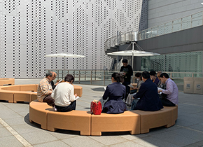 企画展示室の地下2階・地上1〜3階までの全部を使って展示される作品・資料はその数435点。これらは8点を除きすべて東京都現代美術館の収蔵品(寄託品を含む)です。 11時の途中集合までの短い時間で全部を鑑賞することは到底不可能。私は今年のART LABOのテーマ「1960年代〜1980年代の美術を探る」に該当する1階の「第5章 アンフォルメルとの距離」から展示室を廻り始めました。 メンバーは駆け足の鑑賞から戻って途中集合場所の美術館中庭に再集合。ここは美術館改修前は一般の立入りができなかったエリアだったと思うのですが、リニューアルされた現在は新しいベンチも設置された開放的な空間に変わっています。この日は明るい陽光が射し込む心地良い場所となっていました。 |