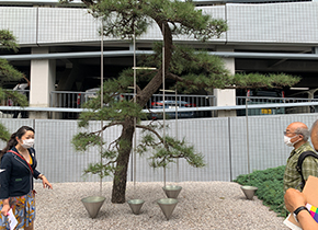 ★レベッカ・ホーン 無題(植栽内オブジェ) https://www.faretart.jp/art/8/ レベッカ・ホーンは、ナチスの強制収容所など既存のものを使って、場の記憶を作品にする作家です。この作品では、松・金属棒・じょうごにより大地と水と植物を自然のエネルギーの循環を表現しています。 ・松の枝に作品を結びつけるのに革を使っている。日本的な素材とヨーロッパ的な技法/古典的なイメージと現代的な造形との対比が面白い。 ・松の枝と金属棒が風で揺れる。環境的な「できごと」をはらんでいる。 |