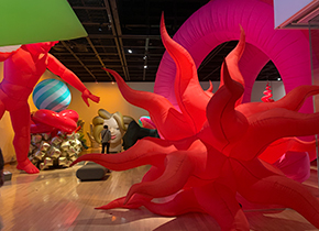 高橋士郎の作品は「空気膜造形」というもので、一見巨大な風船のように見えますが、実はコンピュータ制御で常に空気が送られているのだそうです。 時折もにょもにょと動くものもあります。 日本の神話「古事記」に登場するさまざまな神様が造形されているのですが、それぞれの特性が形となり、時にはユーモラスで楽しく、またおおらかさと神々しさが漂う不思議な空間となっていました。 |