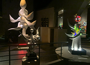 この美術館の特徴の一つに、常設展示と企画展示がひと続きになっているということがあげられます。 入場者は岡本太郎の作品や資料を見たり、太郎デザインの「坐ることを拒否する椅子」にすわってみたりしてから、通路を通って企画展示室に入ります。 今回の企画展示は「高橋士郎 古事記展 神話芸術テクノロジー」。展示室の中央には岡本太郎の彫刻「神話」が置かれ、その回りに高橋士郎の作品が配置されています。 |
