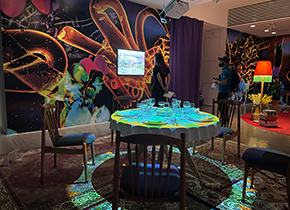 展示の大きな特徴は大掛かりで色彩豊かなプロジェクションマッピングとヴィデオ・インスタレーションです。ヴィデオ・インスタレーションはソファに座ったり、あるいは靴を脱いでベッドに横たわったりして映像と音を鑑賞する没入型となっておりとてもユニークでした。