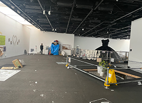階段を上った先はアスファルトで舗装された《道》であり、会期中ここで様々なプログラムが開催され、その痕跡が残されていました。美術館の中にこれほど大きな造作が有るのは初めて見たような気がします。《道》の終わりにある大きなごみ袋の《ゴールド・エクスペリエンス》は、社会と常に隣り合わせの環境問題の比喩と取れました。