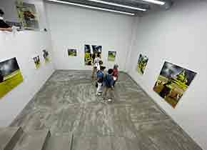 オープンな階段を降りた地下のスペースの壁にも同じような黄緑色で描かれた作品が並ぶ。 |