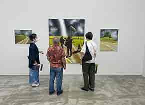 案内は、山内先生のお知合いで、起業からコンサルティング等マルチに活躍されている武田悠太さん。前日(9月30日)レセプションがあり、本日の14時オープン。と、その前にご厚意で鑑賞させていただきました。 ■DDDホテル併設のギャラリー【PARCEL】へ こちらのギャラリーのディレクターは佐藤拓氏。元々地下の駐車場を改装し、ギャラリースペースとした場所。駐車場横の細い扉から入るような作りで、隠れ家的ギャラリーという感覚。白塗りの壁に淡い色合いの黄緑色の絵画作品が並ぶ。 |