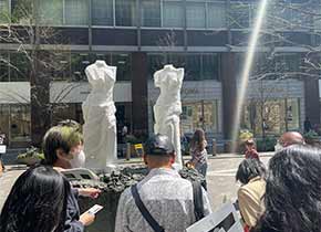 今年度のテーマ「アーティストを深掘りする(サイトスペシフィックアートをメインに)」に合致したイベントを山内講師から紹介され、出品作家へのインタビューとイベント訪問を通じ、新たな展示形式を堪能しました。 (参加者 計8名 ) [概要] 「有楽町ウィンドウギャラリー2023」では、14組のアーティストの作品が「丸の内仲通り」周辺の9店舗に展開し、作品の購入も可能な新しい体験を提供しています。今回のアートラボでは、まず四谷の教室でその出品作家のひとりである岩谷雪子氏にzoomでインタビューを行い、その後、現地に移動し、イベントの主催者である「一般財団法人カルチャー・ヴィジョン・ジャパン」の鈴木育子氏の案内で各店舗の作品を鑑賞しました。