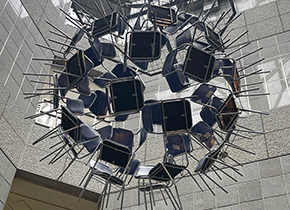 美術館中央の吹き抜けには、ミシェル・ドゥ・ブロワンによる《樹状細胞》が吊り下げられています。会議室用の椅子を組み合わせて球体にしたもので、椅子の足が外側に向けて突き出しています。一見ウィルスのように見えますが、タイトルの樹状細胞は身体を守る免疫細胞です。 まさに座ることを拒否する椅子の集合体で、かたくなに自己を守ろうとする意志が感じられるような気がしました。この作品は美術館の階によって見え方が違うのでそこも面白く感じました。 吊り下げられたその下にはハンセン病の人々に尽くしたダミアン神父像などいくつかの宗教的な彫刻があります。 |