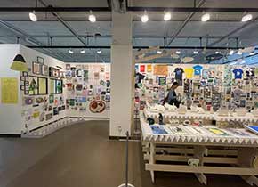 その他、企画展のチラシやポスター、オリジナルグッズの数々がざっくり分類されながら壁面いっぱいに飾られたエリアもありました。 イラストレーター原田治さん、絵本作家五味太郎さんなど著名なクリエイターが過去にデザインした展示もありました。 |