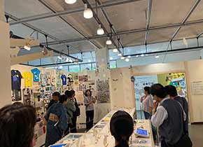 説明を聞いた後、展示室を案内していただきました。 「デザニャーレ展」の会場は、将来はニューヨーク・ブロンクス動物園のような、様々なデザイン担当のスタッフによって構成されているデザイン室を作りたいという願いを込めた、未来のデザイン室(通称デザニャーレ)という設定になっています。 タイトルの「デザニャーレ」とはデザインの語源であるラテン語の「designare」から作られた造語で、designareの音が「ニャー」と聞こえることから名付けられました。 入口の名札にあるスタッフの名前も「対馬虎雄→ツシマヤマネコ」「鯰江あみ→ナマズエ(英訳のキャットフィッシュ)」など猫にちなんでおり、見る人を“にやっ(ニャッ)”とさせる仕掛けもあって楽しいです。 |