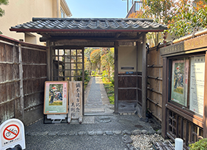 和風建築の邸宅のような入り口をくぐると、奥に美術館の建物が現れます。日本画家鏑木清方が住んでいた土地を利用し1998年に開館しました。館内には清方の画室もそのまま再現されています。 鏑木清方は1878年東京神田の生まれ。戦禍で自宅を焼失し、68歳の時に鎌倉へ移住後、93歳で亡くなるまでこの地で暮らしました。 さて、今回の企画展のテーマは「着物の美−清方美人の着こなし」です。アートラボの今年の総合テーマ「美術における衣食住」の衣カテゴリーに入るかと思います。学芸員さんのお話を聞く機会を得て、清方について理解を深めることができました。 |