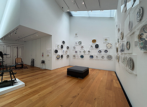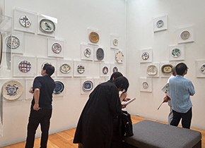 壁紙の森の木にとまっているように展示された陶器の鳥たち。魚が載っているように描かれた、だまし絵のような皿。闘牛場になっているボウル。 グラスや果物が載った皿を描いたお皿が、テーブルの上に置かれていました。この展示の仕方には、生活の中にあるお菓子のように、アートを身近に見てほしいという意図が込められているのだそうです。 |
