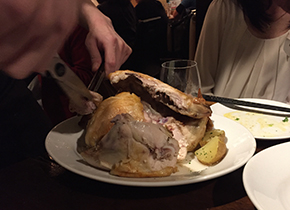 鶏の丸焼きが、そのまま1テーブルに1羽ずつ・・・。今回は、4テーブルでしたので、みなさまで4羽(驚)!。 これには、みなさまカメラを向けておられました(笑)。 とてもふわふわで味もお上品でかなりおいしかったです。 ん〜忘れられない味です。。。 さて、今回もアート好きな仲間たちとお話する時間は、楽しいものですね。アートを中心として、その周辺のお話にいろいろな発見があり、まさに交流会ならではの視野の広がり方があるなあと、実感いたします。 |